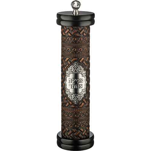 בית מגילה מהודר בעיצוב קלוע בגוון חום כהה, עם לוחית כסף "מגילת אסתר" וסוגר עליון מעוטר באבן קריסטל.