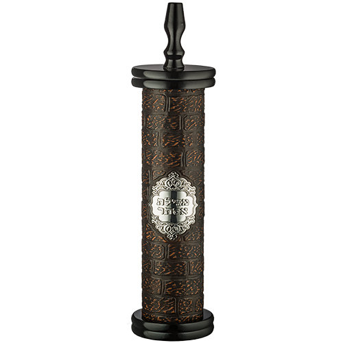 בית מגילה מהודר בעיצוב מרובע חום כהה עם דוגמת חריטה ולוחית כסף "מגילת אסתר", כולל ידית אחיזה עליונה.