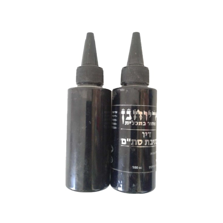 שני בקבוקים של דיו לכתיבת סת"ם, אחד מהם עם תווית ובה כתוב "דיו יוחנן".