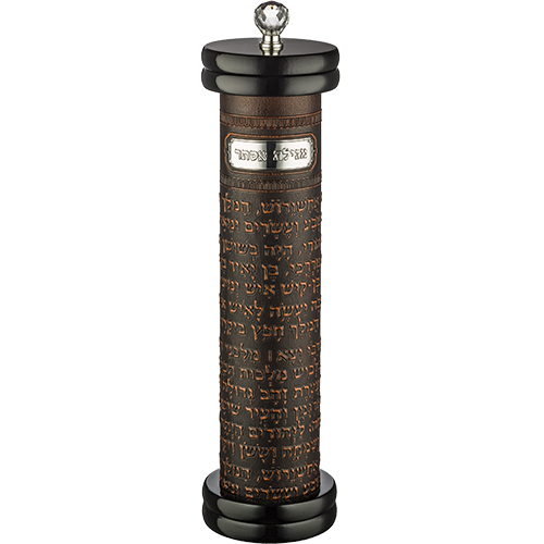 בית מגילה מהודר בעיצוב גלילי עם חריטת טקסט וסוגר עליון מעוטר באבן קריסטל.