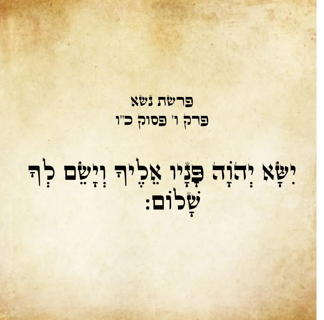 המילים "ישׂא ה' פניו אליך וישׂם לך שׁלום:" מתוך ספר במדבר, פרשת נשא, פרק ו', פסוק כ"ו. הטקסט כתוב באותיות עבריות מנוקדות על רקע דמוי נייר.