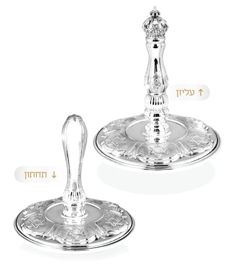 זוג עצי חיים לספר תורה, מצופים כסף ומעוטרים, עם רקמה מוזהבת באמצע.