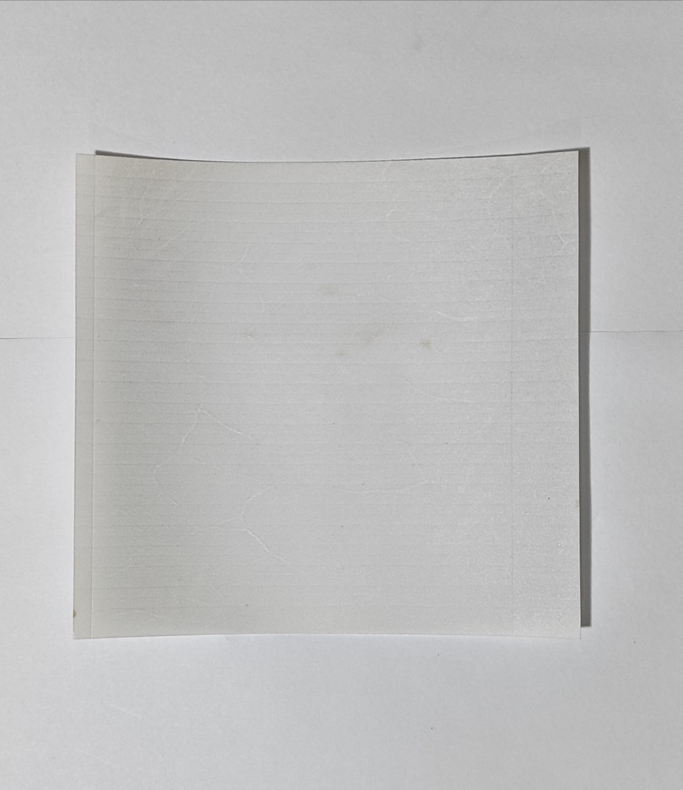 קלף מלבני בהיר עם קווים אופקיים חלשים מונח על משטח אפור בהיר. הקלף מעט מקומט.