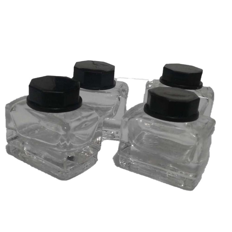 בקבוק דיו שקוף מרובע עם פקק שחור.