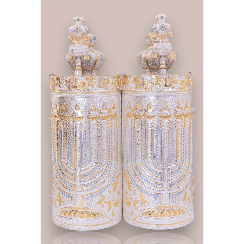 כיסוי לספר תורה מעוטר, בטקסטורת יהלומים, עם רקמה של סמלים יהודיים וחיפוי כיפות כסף וזהב.