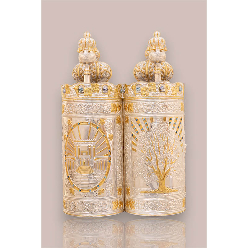 כיסוי לספר תורה מעוטר, בטקסטורת יהלומים, עם רקמה של בית מקדש ועץ חיים.
